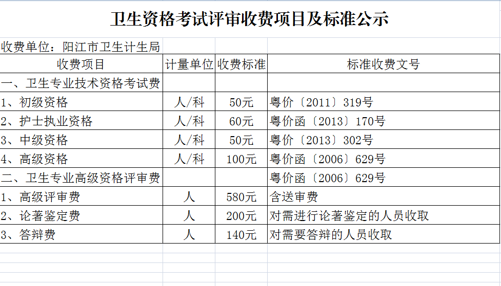 卫生资格考试评审收费项目及标准公示