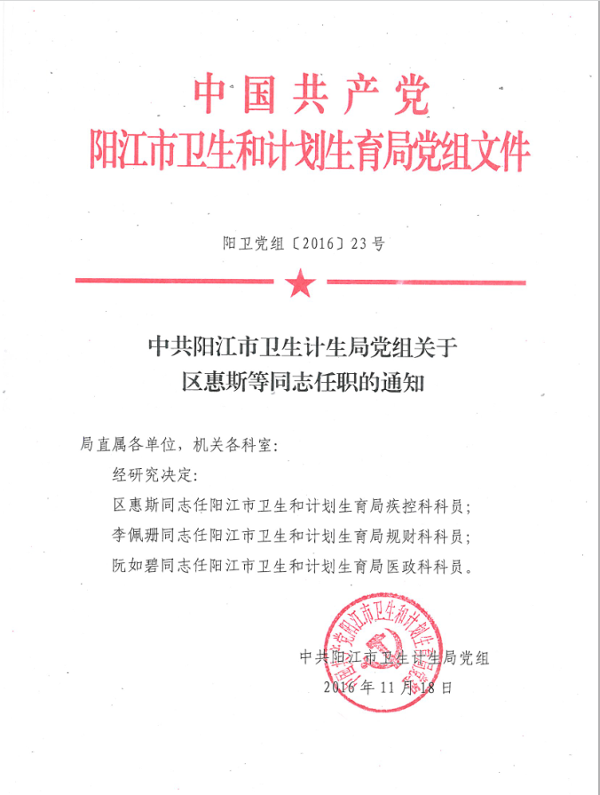 中共阳江市卫生计生局党组关于区惠斯等同志任职的通知