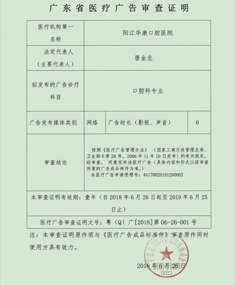 广东省医疗广告审查证明(阳江华康口腔医院)